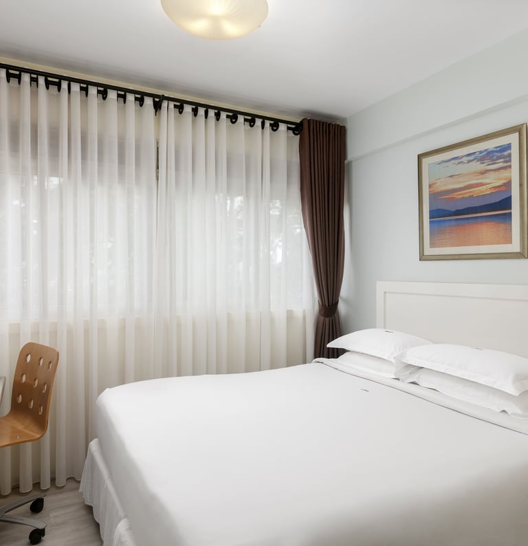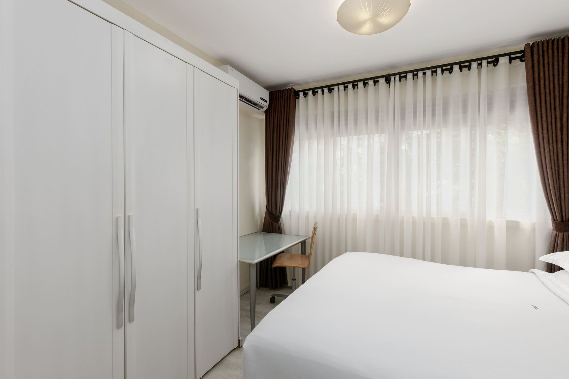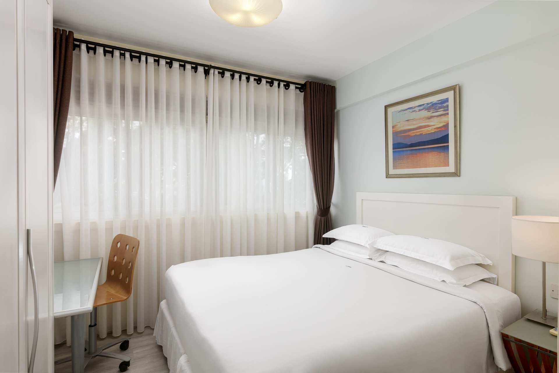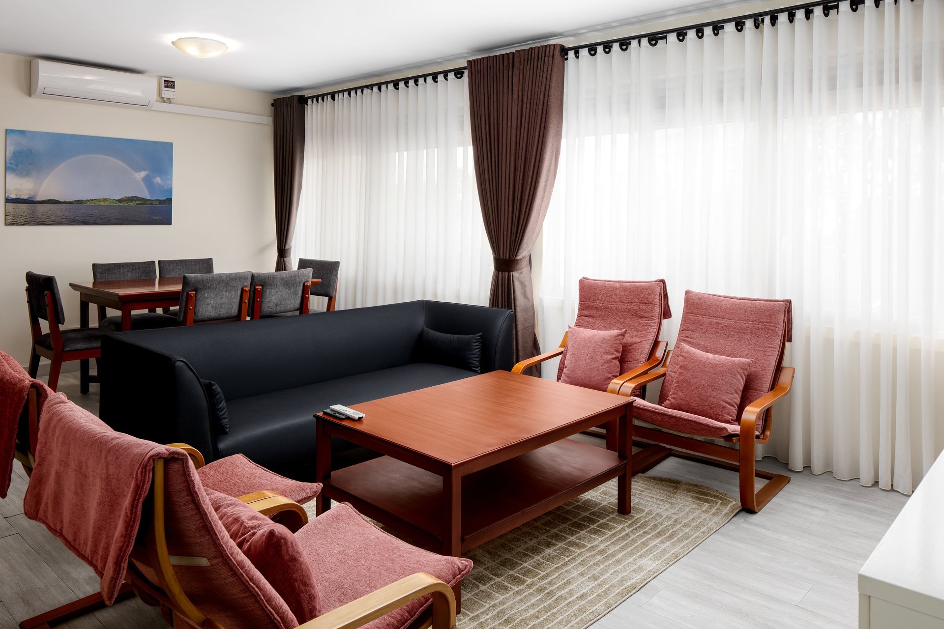 The central living room is a relaxing, airy space with both dining and lounging areas. Its simple, modern design combines light wood and leather furnishings, while the large windows come with window sheers and curtains. A 34” TV and telephone are provided. There are two bedrooms and two bathrooms. The bedrooms come with ample storage and desk areas.