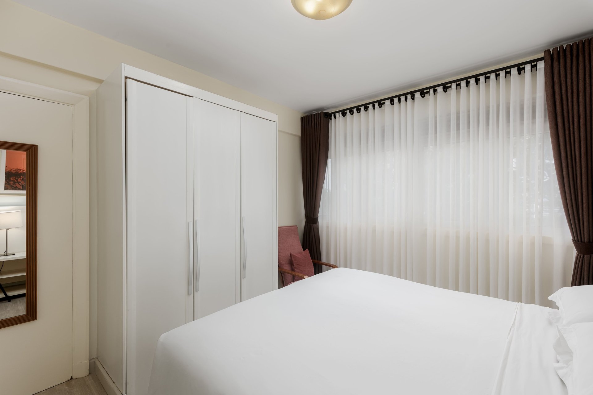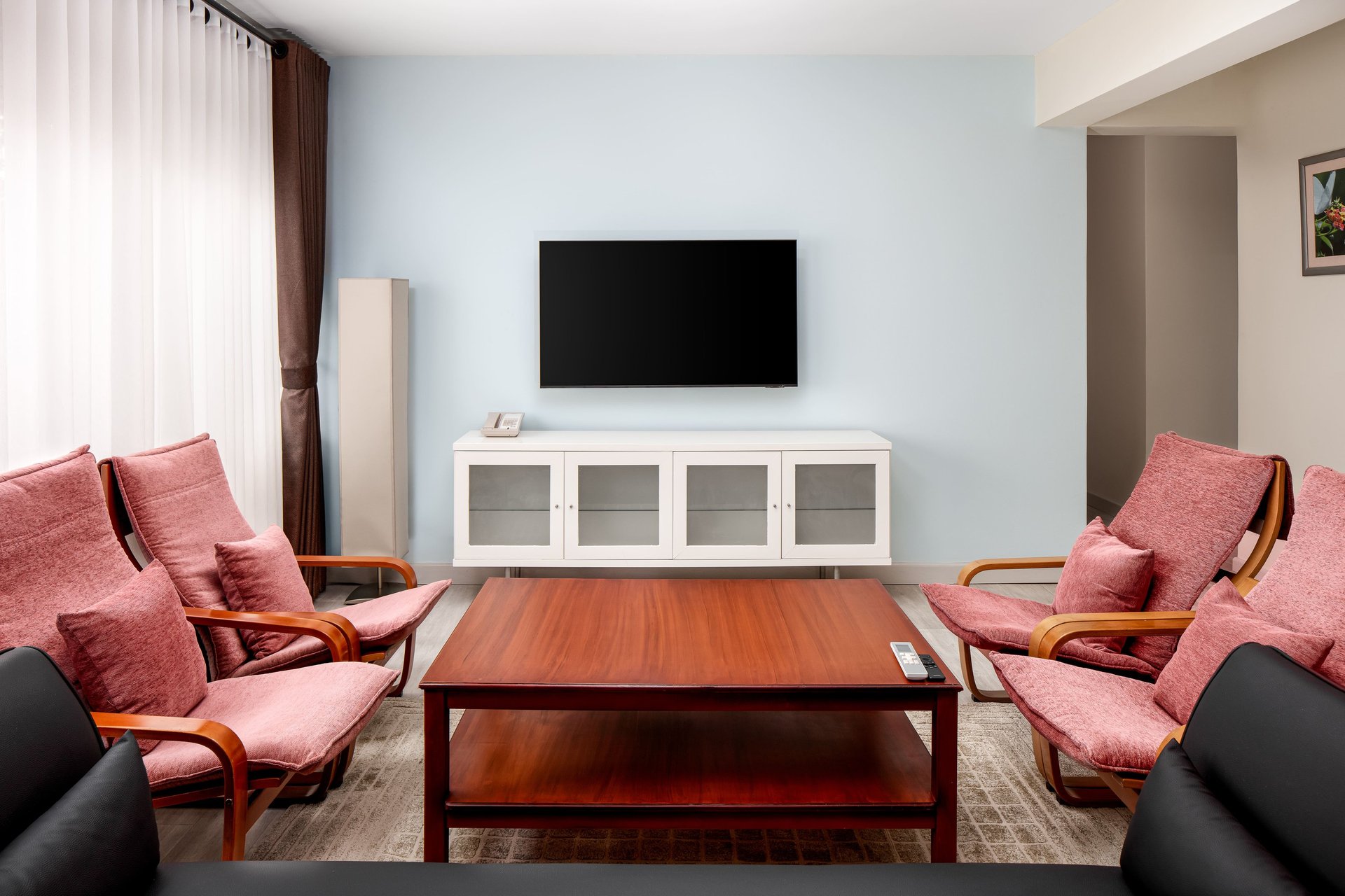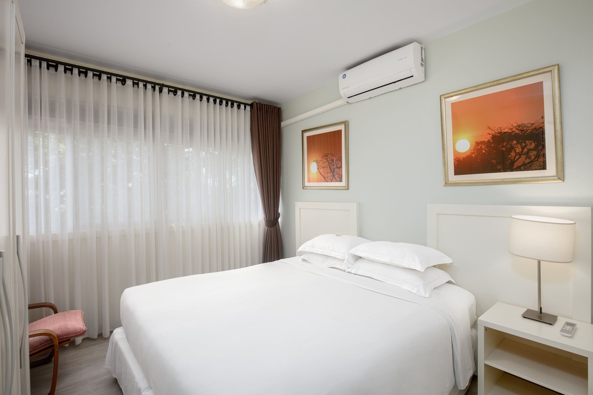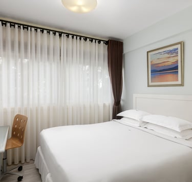 The central living room is a relaxing, airy space with both dining and lounging areas. Its simple, modern design combines light wood and leather furnishings, while the large windows come with window sheers and curtains. A 34” TV and telephone are provided. There are two bedrooms and two bathrooms. The bedrooms come with ample storage and desk areas.
